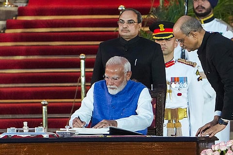 PM-designate Narendra Modi takes oath as prime minister for the third consecutive term, at Rashtrapati Bhavan in New Delhi.
