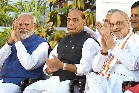 PM-designate Narendra Modi with Rajnath Singh and Amit Shah at Rashtrapati Bhavan ahead of the oath-taking ceremony as prime minister for the third consecutive term, in New Delhi.