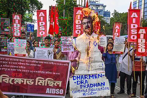 Members of All India Democratic Students' Organisation (AIDSO) burn an effigy during a protest over the alleged irregularities in the NEET-UG results and UGC-NET exam cancellation, in Kolkata.