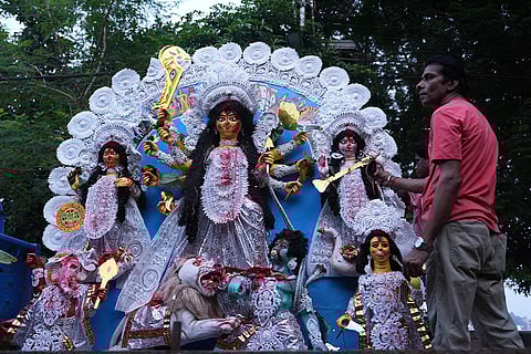 Devotees carry an idol of Goddess Durga for visarjan (immersion) on the banks of the Ganga river marking the end of the Durga Puja festival, in Kolkata.