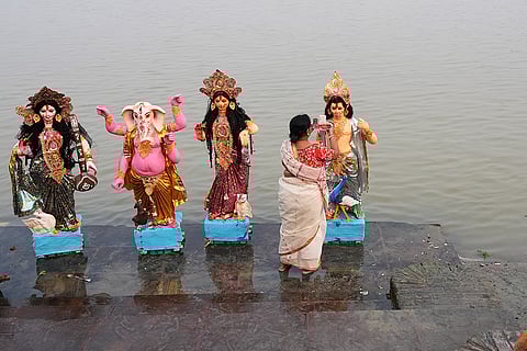 People perform 'aarti' of idols before immersing in the Hooghly River