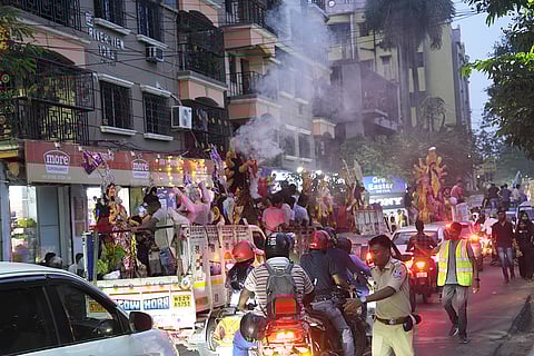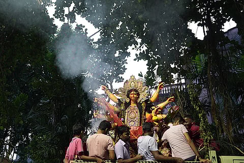 Devotees participate in an immersion procession of Goddess Kali on the occasion of 'Vijayadashami', in Kolkata.
