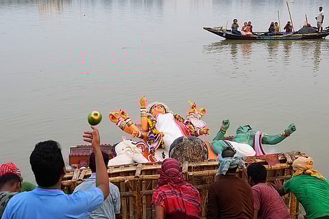 Durga visarjan on the banks of the Ganga river in Kolkata.