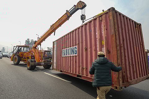 A shipping container being placed to block National Highway 44 in view of farmers' 'Delhi Chalo March', near Singhu border in Sonipat district.