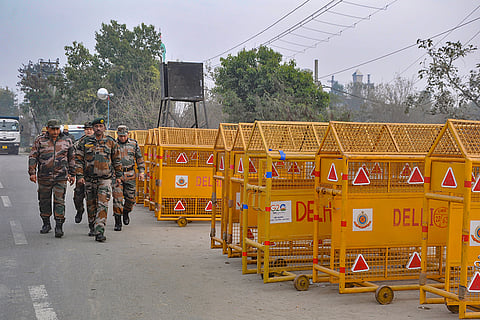 Security personnel deployed near Singhu border in view of farmers' 'Delhi Chalo March', in Ghazipur border in New Delhi