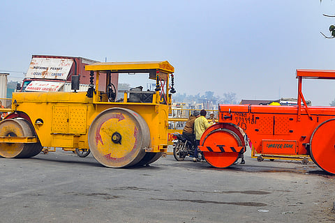 Road rollers, acting as a barricade, parked near Singhu border in view of farmers' 'Delhi Chalo March', in Sonipat district.
