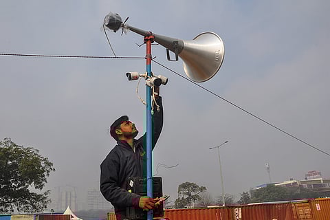 A workers installs CCTV cameras near Singhu border in view of farmers' 'Delhi Chalo March', in Sonipat district.