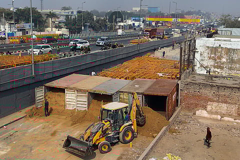 Barricades being put up at Ghazipur border in view of farmers' 'Delhi Chalo March', in New Delhi.