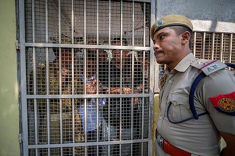 Police restrain opposition Congress party workers from coming out of the Assam Pradesh Congress party office to prevent them take out a protest against the Citizenship Amendment Act (CAA) in Guwahati.