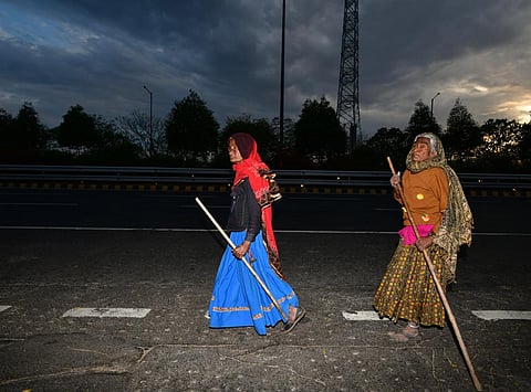Kajodi has been walking for three hours. For every step now, she has to lean herself on a stick and push herself using her arms. But she has to keep walking. Nobody knows her certain age. She is over 90, says one while another claims she is over 100. The family group she is with is already ahead of her. They lived in Noida Sector 15 – most of the members selling toys at traffic lights in Delhi – and are now walking back to their village in Rajasthan’s Sawai Madhopur, almost 400 km away.