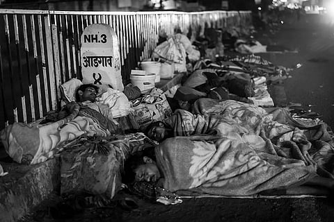 As millions in our cities locked themselves in, life for those who built our homes, our roads, or did our dirty chores has moved outdoors. You can’t see them from your balconies or through windows—the curtains are drawn anyway to block the harsh May sun. They too stay away from the day’s heat. It is at night the Gates of Hell open. Group upon group of terrified, starving, exhausted people leave the cities they built, carrying with them precious items packed into sacks. Cellphones to reach out to relatives at home in villages they were born, hundreds of miles away. Some clothes, biscuit packets, bread. They flee on foot, bicycles, hitch a ride on goods-laden trucks…And much before the break of dawn, with stars filling the sky, they stop—hungry, thirsty and tired—to rest under the shade of a tree or a school converted into a shelter for migrants. “Stick around. It’s nice to have you here,” a man implores, unwrapping a gauge of rag to reveal a blistered foot, in one such home for the homeless in Nashik. “The first few days, I didn’t leave my house out of fear. Then the food and money ran out. I felt impotent when I went out looking for handouts. It created a moral conflict. I have never begged. I think this is the result of bad karma.” He pulls out a ball of soiled newspaper from his bag. Soaked chickpeas, his dinner. He puts some in his mouth. He used to come home knackered every night from back-breaking work at construction sites or in clattering factories—someone paid at the end of a day’s labour had little choice about his job site. These have gone silent in the nationwide stay-home order to stop a contagion from spreading. A modest, self-effacing man, he could not have cared less. But the strict restrictions imposed on the population have stifled life. Soon, with no money to buy food or pay the rent, he joined the thousands of migrant workers filing out of the cities. He has heard that the government and “some rich people” were giving money to the poor. Also, special trains were ferrying people home. He thought of waiting his turn for a train. “But the drawbacks clearly outweigh the benefits,” he says. As the night unfolded, time pressed on him. “We’re alive for a reason,” he philosophises. “Yeh rasta khatam nahin hota, Sir.” Clinging to thinning hopes, and working himself into a trance, he hobbles out of the room and into a landscape that defies easy explanation, an expanse of road filled with meaning.