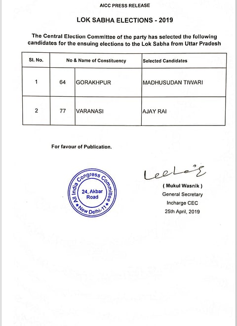 In a notification released by the Congress party on Twitter, the Grand Old Party’s Central Election Committee announced Ajay Rai and Madhusudan Tiwari’s name as its candidates for the ensuing Lok Sabha elections from Varanasi and Gorakhpur, respectively.