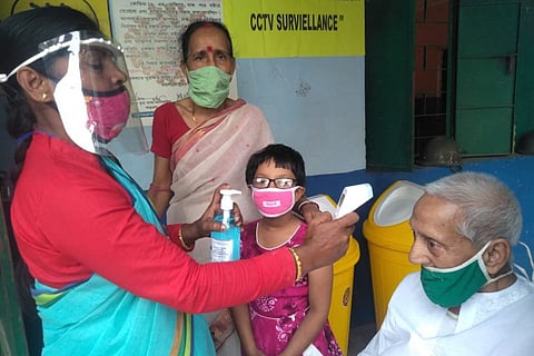 11.45 am: A voter undergoes a temperature screening before entering a polling booth in West Bengal’s Jhargram.