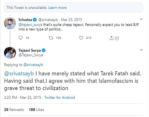 Even though he has deleted the tweet, screenshots of the same are doing rounds on twitter, attracting vehement criticism towards the 29-year-old South Bengaluru MP.
