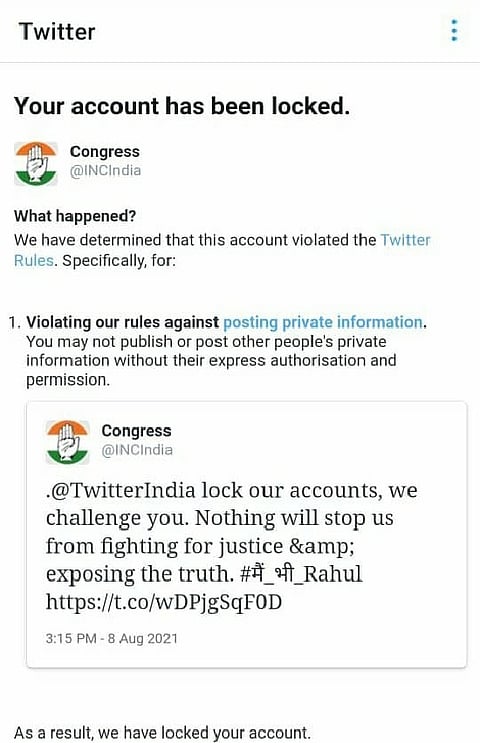 The Congress has alleged that Twitter has locked the party's official handle and the accounts of nearly half a dozen leaders.