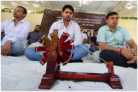 Congress leaders in Delhi observed a 'maun vrat' near the lieutenant governor's office in the capital on Monday and demanded the resignation of Union Minister Ajay Mishra Teni.
