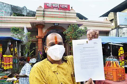 The chief priest of a Mumbai temple brandishes Governor Koshyari’s letter asking the CM to reopen temples in Maharashtra.