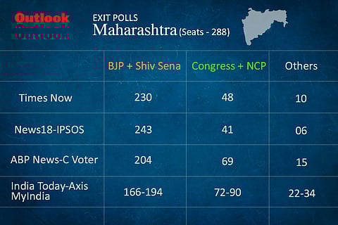 The News18-IPSOS exit poll predicts a landslide for the BJP-Shiv Sena alliance in Maharashtra with 243 of the 288 seats in the assembly, followed by the Congress-NCP coalition winning just 41 and others 6.