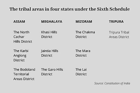 The tribal-majority Meghalaya has three ADCs that cover practically the entire state, except for a small part of Shillong. Assam has three ADCs and Tripura one, all with Sixth Schedule powers.