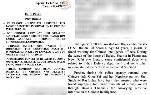 Delhi Police’s Special Cell arrested freelance Journalist Rajeev Sharma for allegedly passing “sensitive information” to Chinese intelligence agencies. The arrested scribe was allegedly passing information about Army deployment along the Line of Control (LoC) and India's border strategy to Chinese intelligence.