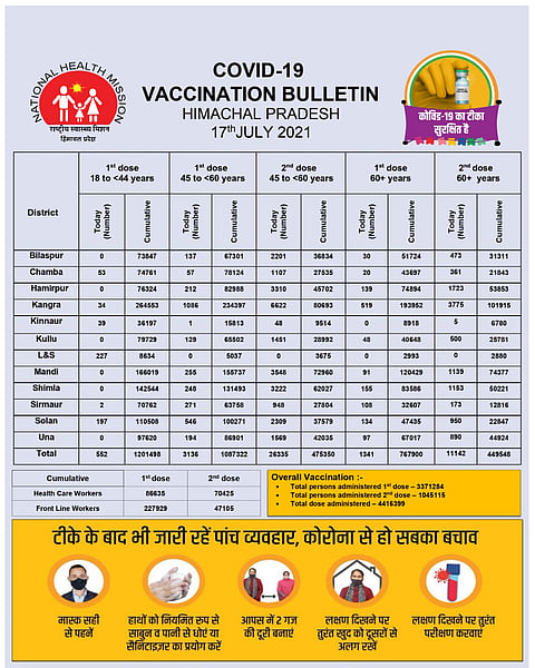 Currently, of 55 lakh eligible population, Himachal Pradesh has administered Covid vaccination to 44.16 lakh people of which 33.71 lakh given first dose and other 10.45 lakh second dose.