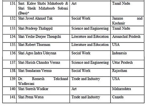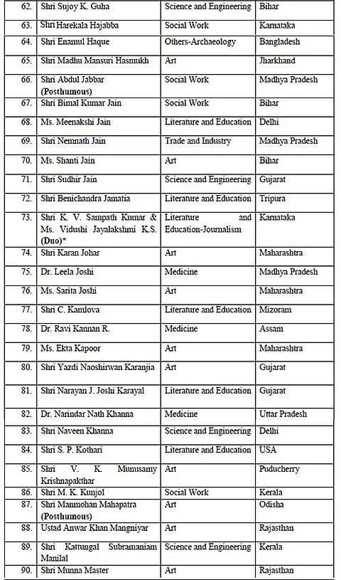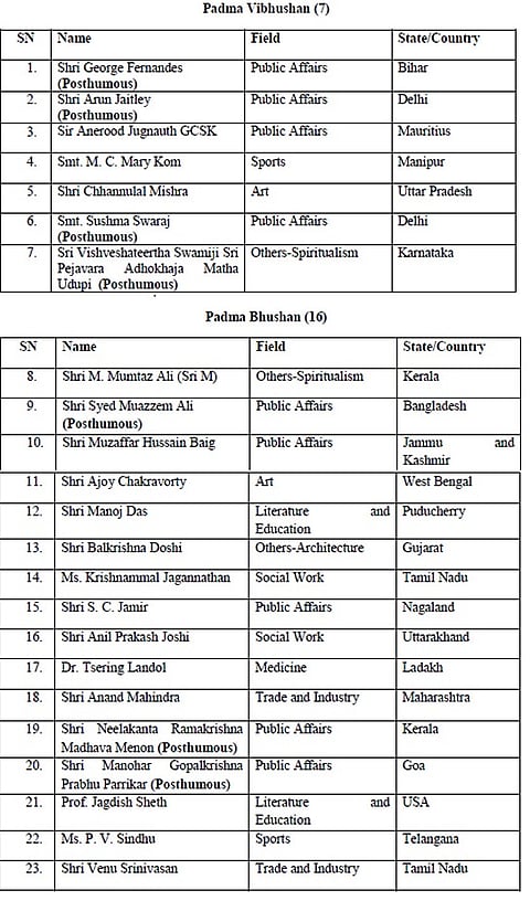 Former union ministers Arun Jaitley, Sushma Swaraj and George Fernandes, Olympian boxer Mary Kom and former Mauritius prime minister Anerood Jugnauth were among seven prominent personalities awarded the Padma Vibhushan on Saturday, the Home Ministry announced.