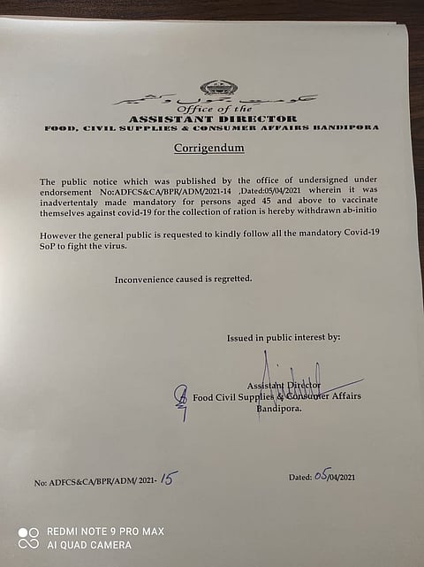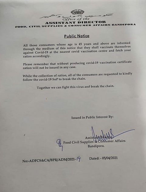 In Kashmir’s Bandipora district, officials have issued an order making it mandatory for persons above 45 to get themselves vaccinated against Covid-19 to collect their government ration. Issuing the order, the Assistant Director, Food, Civil Supplies and Consumer Affairs, Bandipora on Monday said, “Please remember that without producing Covid-19 vaccination certificate, the ration will not be issued in any case.”