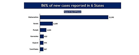 After months of decline in Covid-19 cases, Maharashtra, Kerala, Punjab, Karnataka, Gujarat and Tamil Nadu have reported a sudden spike in the daily new cases. In the last 24 hours, these states have registered a total of 18,599 new cases, out of which, Maharashtra has reported the highest daily new cases at 11,141, followed by Kerala at 2,100 while Punjab reported 1,043 new cases.