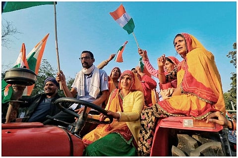 (Women farmers arriving on tractors to farmers' protest sites | Credit: PTI)