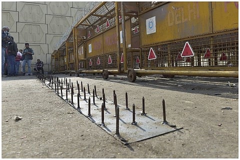 Videos and images of nails being driven into the ground at the Tikri border to stop protesting farmers from entering Delhi led to widespread outrage. According to reports, the digging of nails disrupted the water supply to protest sites. Protesters responded by installing makeshift water pumps and geysers. Heartening images of farmers planting trees in response to the nails also went viral.