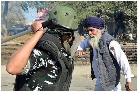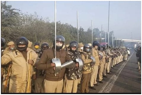 Images of police officers standing with metal lathis and firearms also caused outrage. The images surfaced in February after reports of a police officer getting injured in a scuffle with an alleged farmer protester wielding a sword.
