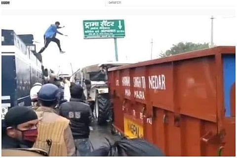 (A young protester Navdeep Singh jumping from vehicle to vehicle to turn off the water cannon | Image credit: Twitter/@awantikatewari)