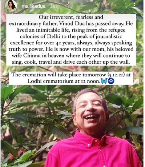 His daughter, Mallika Dua's Instagram story announcing his death summarised his life and career. Mallika, who is also a well-known actor-comic said: "Our irreverent, fearless and extraordinary father, Vinod Dua has passed away. He lived an inimitable life, rising from the refugee colonies of Delhi to the peak of journalistic excellence for over 42 years, always, always speaking truth to power."