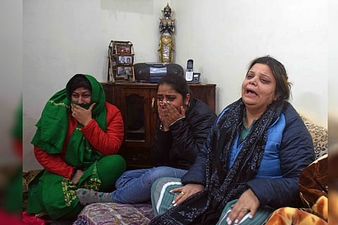 Wailing relatives of goldsmith Satpal Nischal who was shot dead by unknown gunmen outside his shop at Saraibala area of city centre Lal Chowk, late evening 31 December 2020 (Photo credit: Umer Asif)