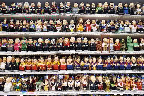 A Gandhi ‘caganer’ clay figurine sits with real/fictional personalities at a Barcelona shop.
