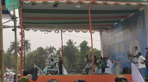 Thousands of people ranging from excited children to euphoric elderly women gravitated towards the smoke-white chopper of Chief Minister Mamata Banerjee of West Bengal as it hovering over Nabadwip, a small town in Nadia, familiar for its religious significance. As the chopper landed, the chorus of cacophonous party slogans reverberated through the town as a white wheelchair-bound Ms Banerjee went up on the stage to greet people for the Bengali New Year and Ramadan before delivering her speech.