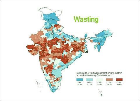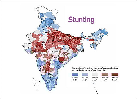 As India fights the scourge of malnutrition through its flagship Poshan Abhiyaan programme, large swathes of parliamentary constituencies across the states of Uttar Pradesh, Rajasthan, Madhya Pradesh, Bihar, Jharkhand, and Gujarat are seen to have “very high burden” of child malnutrition indicators, like stunting, underweight, wasting, low-birth weight and anaemia, a Harvard University study, helmed by an Indian-origin researcher, has found.