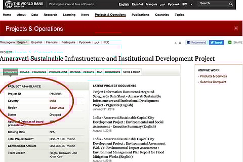 The World Bank has pulled out $300 million lending to the Amaravati Capital City project in Andhra Pradesh, the ambitious project of former chief minister Chandrababu Naidu. The World Bank website shows the status of the ‘Amaravati Sustainable Infrastructure and Institutional Development Project’ as ‘Dropped.’ (See screenshot below)