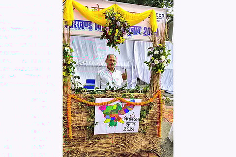 MoS Defence Sanjay Seth casts his vote during the 1st phase of Jharkhand Assembly elections, in Ranchi.