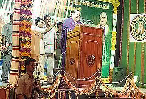 But the audience has come see Jayalalitha, not listen to her. Even when she makes the odd, new, interestingpoint there is no applause. Certain portions of the script even I know by heart. That she was not the one whoapproached the people only at the time of elections; that in the last three years she had attended 32functions in districts to launch development works worth Rs.9,694.20 crores; that she worked 20 hours a day tomake Tamil Nadu the No. 1 state; that in three years she has achieved development possible only in 30 years. Her appellations for her opponents also remain the same: Loudmouth Vaiko, Caste Fanatic Ramadoss, ParasiticKarunanidhi.In one instance, Amma’s speech from a previous rally was played to engage a crowd waiting forhours. After Amma arrived, she read out the same speech and the audience was not amused. The party’sdistrict secretary was ticked off.