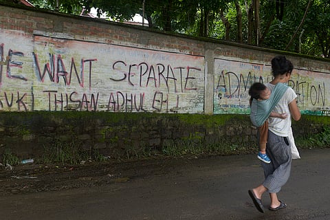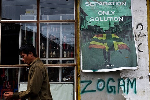 A poster declaring “Separation Only Solution” along with a Zomi flag in Churachandpur where Kuki-Zo communities have demanded a separate administration following last year’s ethnic clashes.