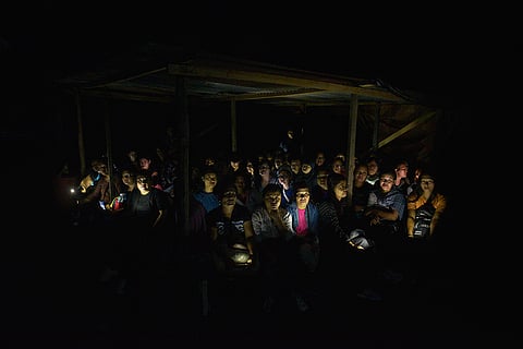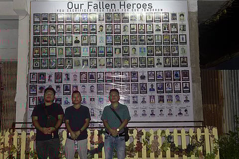 Members of tribal civil body Kuki Students Organisation (KSO) stand in front of a “wall of remembrance” outside the KSO office in Kangpokpi to commemorate the Kuki-Zo victims who lost their lives in the ethnic clashes with Meiteis that erupted in May last year.