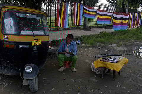 Multi’-coloured Kangleipak’ flags representing the old kingdom of Manipur being sold on streets of Imphal, which has seen a revival of indigenous Meitei nationalism and religion since the conflict.