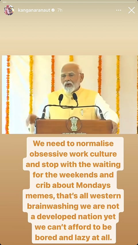 Renowned actor and newly-elected BJP MP Kangana Ranaut on Tuesday made fresh controversial remark while stressing the need to "normalise obsessive work culture" where the actor said Indians can't afford to be lazy as the country is yet to become a developed nation.