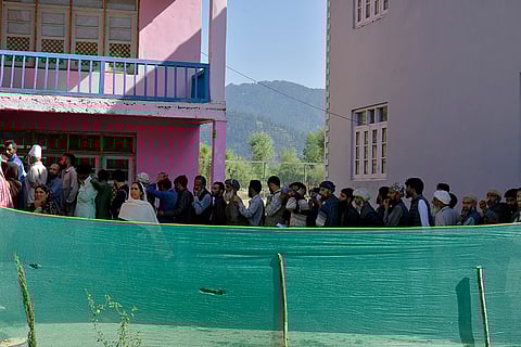 People standing in queue waiting for their turn to cast votes in Kokernag area of Anantnag, South Kashmir.