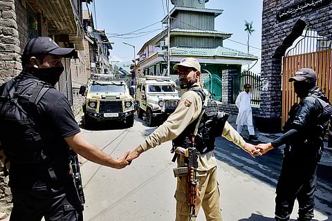 Police personnel block the road towards the polling booth for the press as the former Chief minister Mehbooba Mufti casts her vote in Bijbehara, Anantnag, South Kashmir.