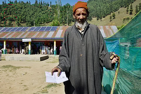 An elderly man shows off his voting slip after casting his vote in Kokernag area of Anantnag, South Kashmir.
