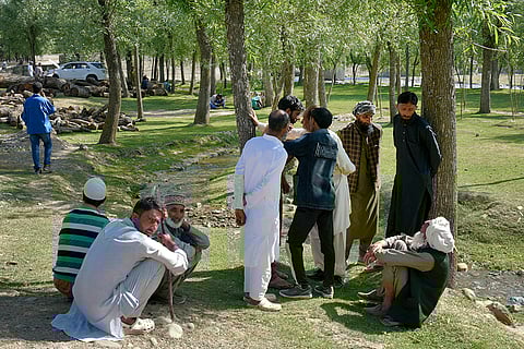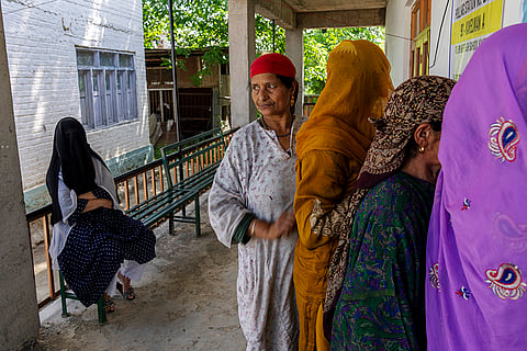 People sitting outside the polling booth after casting their votes in Kokernag area of Anantnag, South Kashmir.