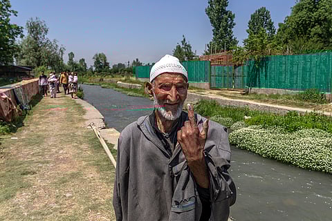 An elderly Kashmiri man shows the indelible ink mark on his index finger after casting his vote during the sixth round of polling in India's national election in Adlashmagam, south of Srinagar.