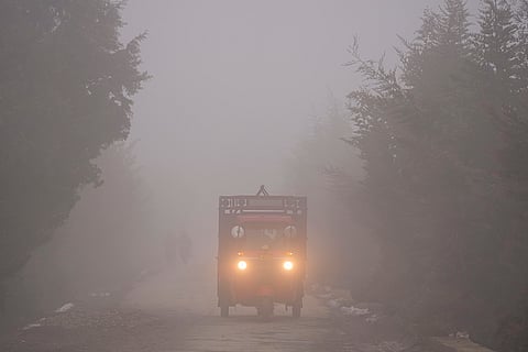An auto-rickshaw moves with its headlights on as dense fog envelops the surroundings on a cold morning in the outskirts of Srinagar.